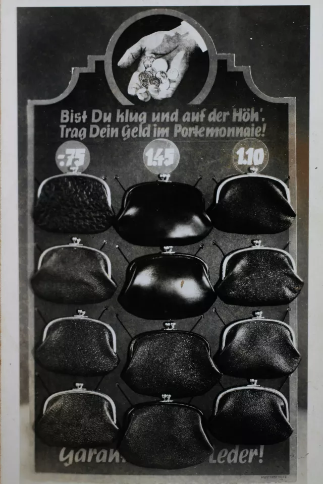 “If you’re smart and on the top, buy a purse in our shop” (“Bist du klug und auf der Höh’, trag dein Geld im Portmonnaie.”).