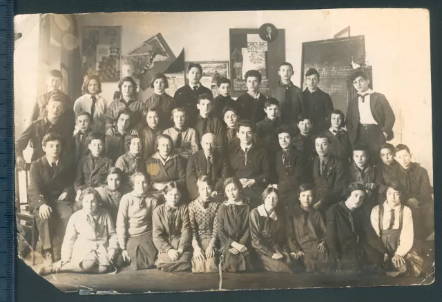These are the pupils from one of our school classes. You can see posters in Hebrew on the wall. It was the creative work of our teacher of drawing, Boris Yefimovich Tsyrlin (sits fifth from the right). He was one of the youngest teachers. Someone informed against him and he was arrested in 1937. However, our headmaster, Kisselgof, was not afraid to come to his defense and issued a perfect reference on him. Tsyrlin was released. He was at the front during the Finnish war [1939-1940] and was wounded. During World War II he was a rifle company commanding officer at the Leningrad front. He died in St. Petersburg in the 1990s.