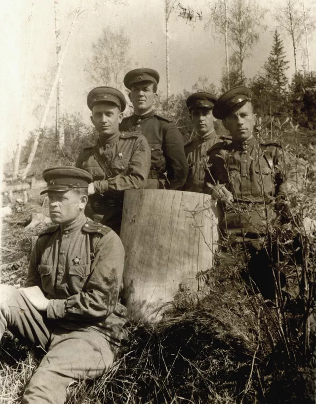 I am the 3rd from the right with my comrades in the middle of impassable marshes and woods. Lieutenant colonel Butaenko, division engineer officer is at the bottom of the picture (sitting). Vladimir Costrov is behind him. He was born in Krasnoyarsk in 1915.
