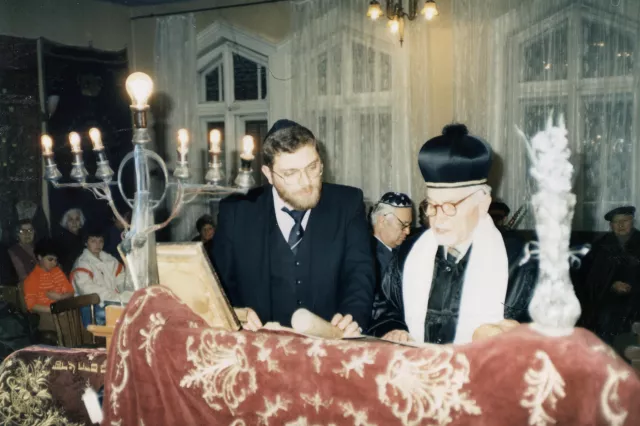 This is a photo of haribi [rabbi] Haim Meshulam, to the right, and Maxim Kohen. As far as I understand they are reading the Megillat Ester for the Purim holiday. Megillat is the scroll of Ester. I can be seen in the background (between them). The picture was taken at the Sofia synagogue in the 1990s. During this holiday, while reading the Megillat when the name of Haman is mentioned, the would-be exterminator of all Jews, everyone patters with his legs. Rattles are also used for that purpose.
