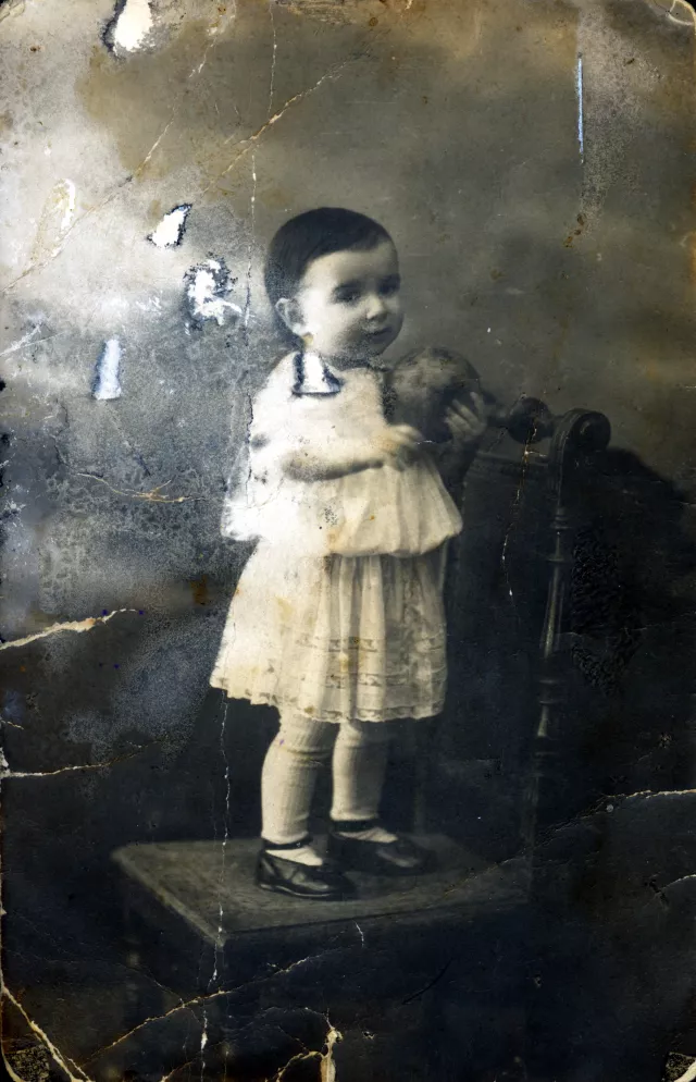 In this photo I am 2 years old. I’m wearing shoes that my father made for me. I’m 87 now, and don’t remember anything about having the picture taken.
