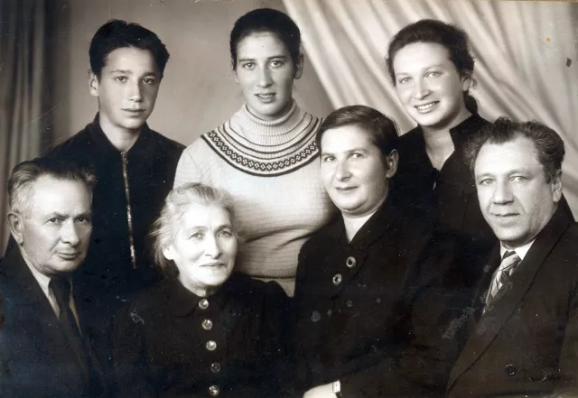 Our children are standing behind us: Eugenia at the right, Larisa in the center in white, Gennady to the left.