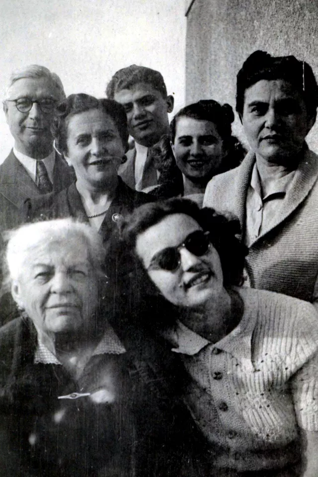 This is a family reunion that took place in March 1946 in Bucharest. Front row, left to right: my maternal grandmother, Rachel Schonfeld [nee Friedman],, and my sister, Mira Cotin [nee Mizrahy]. In the middle row, from left to right, the three women are my mother's sister, Mina Solomon [nee Schonfeld], the niece from my mother's step-brother's side, Renne Wagner [nee Schonfeld], my mother, Henriette Mizrahy [nee Schonfeld]. In the back row, from left to right: Moritz Solomon, next to his wife, Mina Solomon, and my first-degree cousin, Gabriel Segalescu, the son of my mother's sister, Annie Segalescu [nee Schonfeld].