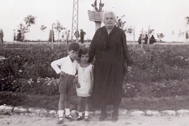 The photograph was taken in 1926, probably at the seaside of the Black Sea. From right to left: Rachel Schonfeld [nee Friedman], my maternal grandmother, together with her grandchildren, my sister, Mira Cotin [nee Mizrahy], and my cousin Marian Solomon.