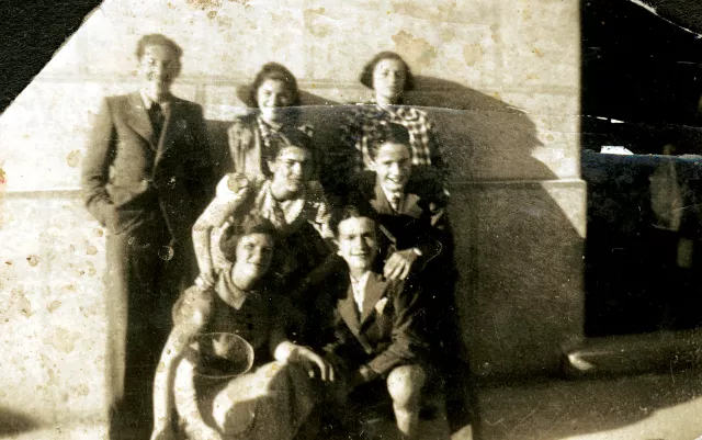 The picture was taken in Banja Luka in 1938. Pictured are members of the Zionist youth organization which we called Ken. Standing from left to right are: Puba Lihnstain, me, next to me is Flora Levi. Kneeling are: Rena Atijas, Puba Kabiljo. Unfortunately, everyone in this picture except myself were killed during the Holocaust.