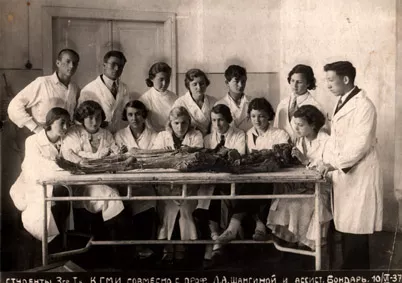 The picture was made in Kursk Medical Institute in February 1937 in the anatomy workshop. Standing the 2nd to the right is I, the 3rd to the left standing is professor Shangina and the 2nd to the left is assistant Bondar The first to the left sitting is my pal Valentina Glagoleva, born in Kursk. We did not keep in touch after I left Kursk in 1938 and moved to Moscow. I do not remember other people in the picture.