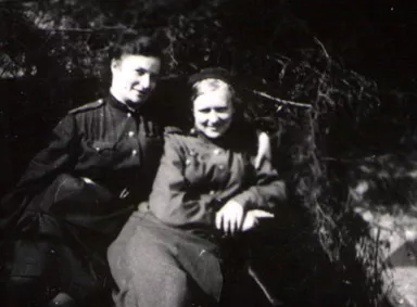 This is I (to the left) with my colleague Tanya Lapshina, who worked with me in mobile field hospital #2407 of attack army #48. This is the year of 1943. The picture was taken in a forest out of Kursk during the break from the operations. I was acting chief of the department, in the rank of a captain of the medical service.