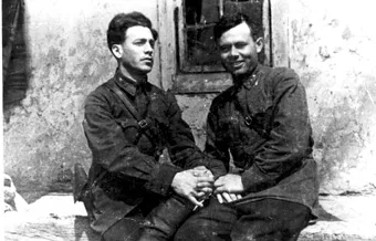 Our political officer Ovitsenov and I, Rahmil Shmushkevich, on the front line, few days before the Kharkov front line forces encirclement and my captivity. Photo made by a correspondent of the "Stalinets" newspaper in the Izyum town in May 1942. In an hour after this photo was taken a shell hit our political officer Ovitsenov killing him.