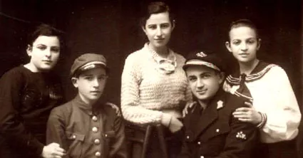 This picture was taken in Rezina by the photographer Golovanevskiy. Here I am with my cousins. I am the first from the left and my cousin Monya Rubel is next to me. Leya Rubel is in the center, Nahman Roitman is sitting on the left, Revekka Rubel is standing to the right. The picture was taken in 1937.