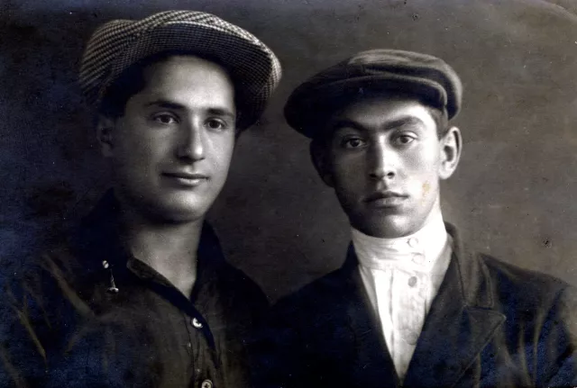 My husband, Semyon Sokolianskiy, with his friend. I don't know his name. This was taken in Kiev in 1924.