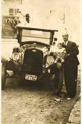 In this picture, taken in Thessaloniki in 1919, my father Raphael Moshe is holding in his arms his daughter Nina Frances, nee Molho, my sister. They are posing next to my uncle’s car.