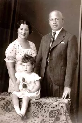 This is my younger sister Raya's family: Raya, her husband Kolia Gorosh and their only daughter Efros. She was about three years old. They were visiting Mama in Aluksne, and were photographed for the memory. This photo was taken in Aluksne in 1938, photographer Andersons.