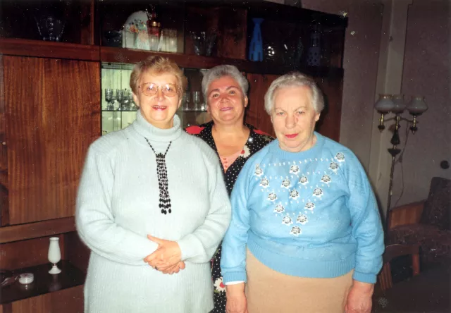 I, Raya Teytelbaumene, am on the right in a blue shirt, my friend Fira in a light dress is next to me, Marite is between us. Marite Zokrus has been my housekeeper since my son’s death. She helped me survive. The picture was taken at my place in Kaunas in 2000.