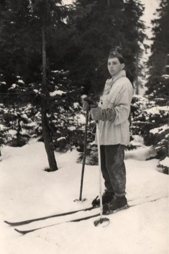 This is a picture of me, Alexander Gajdos, at that time still Goldberger. I changed my name at the beginning of the 1950s. This photo was taken during my army service by Ruzomberk, Smrekovica. It was during the postwar period, I don't remember the exact year. I was a member of a reconnaissance company in Trencin. We also absolved ski training. I don't think that this training was mandatory. Those that wanted, could take it.