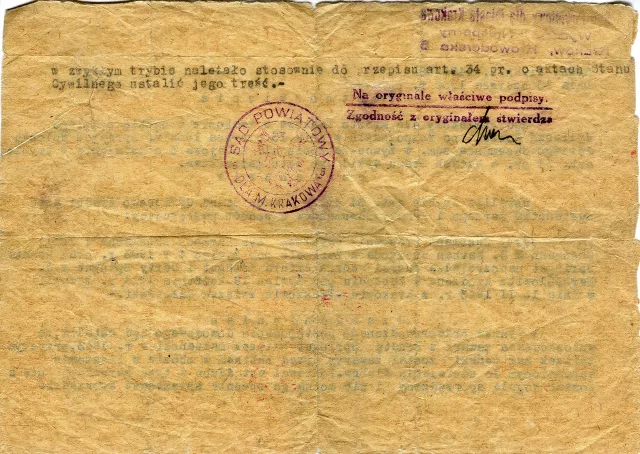 This document was issued on 13th June 1952, by the Court in Cracow. It is the marriage confrmation for my partner Renata Zisman, nee Springut and her former husband Jerzy Zisman. They had only a ritual marriage in Plaszow camp in 1943, which hadn't been registered with any document.