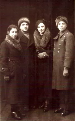This picture was taken in Rezina by the photographer Golovanevskiy. These are my cousins from left to right: Revekka, Monya, Golda Rubel (children of my father’s brother Yankel) and my husband-to-be Nahman Roitman. The picture was taken in 1937 before Yankel's family’s departure for Argentina.