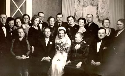 This is my younger sister Revekka's wedding. Revekka is in the center, and her husband is on the left. His surname was Rivlin. On Revekka's right is my mama Ida Kaplan, and our older sister Rosa Shein is on Rivlin's left. Rosa's husband Efrayim Shein is on her left. I am standing on Efrayim's right. Sitting on Mama's left is our older brother Sahne. The 4th on the right is my younger sister Raya's husband Kolia Gorosh. I don't remember his actual first name. Everybody called him Kolia. My younger sister Raya is on his left. I don't remember any other guests. They were the Rivlin family and our friends and relatives. I used to know them, but it was so long ago… This photo was taken in Riga in 1927.