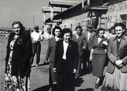 I am the first from the left. Next to me is the well-known Soviet activist - Ekaterina Avramova. Next to her on the left with medals and insignia of honour on the lapel is the well-known at that time in the USSR pig-tender Ekaterina Avramova who was the hero of that visit of the Soviet delegation. On the back of the photo there is an ink inscription that says - Belanitsa village, 17th September 1951.