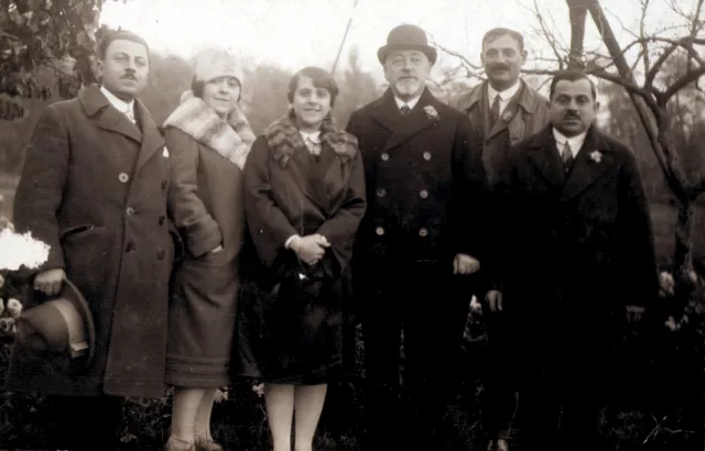 This is my father with some of his siblings, in a photo taken in Szentlorinc in the 1920s. From right to left: Daddy, his brother-in-law Istvan Deutsch; an unidentified man with a hat and beard; father's sister Franci, his sister Irenke, and his eldest brother, Vilmos. I don´t know who the man with the beard is. The group must have been out on some excursion, maybe on the property of Istvan Deutsch.