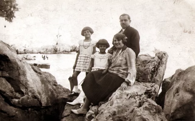 My family in Abbazia. My older sister and I are wearing identical dresses. We were always dressed alike. It was quite common then for siblings to dress that way. There was a shop where children's clothing was sold, called Benesovskij, a name I will never forget. We shopped there every year for our seasonal wardrobes. Mommy had her dresses made in the salon - such an excellent salon it was!