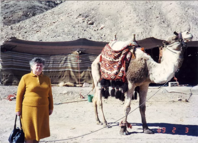This is me, Rifca Segal, in Eilat, being photographed with a camel. I was very scared and I didn’t know how to keep as far as possible from the beast. But my nephew, Talic Segal – who is now living in California but who was still living in Israel at the time –, insisted on having my picture taken. He told me “I’ll stay close and nothing will happen”. Well, nothing happened.