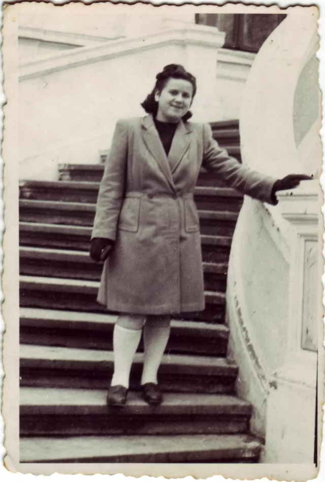 This is me, Rifca Segal, again, on the stairs of a children’s home. It was called Oze and it was subsidized by the Joint. I started my career here, where I worked as an accountant for three years. The picture was taken in 1947, which means that I was 19.