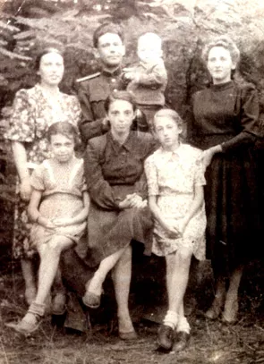 This is our family first postwar photo - standing on the left is my mother Rosa Leibert (in a flowered dress), beside her is my stepfather Boris Evenchik holding my brother Eugeniy, and the woman on the right is my stepfather fellow officer's wife. Sitting from left to right: I, my older sister Maya Leibert, and my cousin Galia, aunt Ola's daughter. This photo was taken in Yavorov in 1952 by my stepfather's fellow officer.