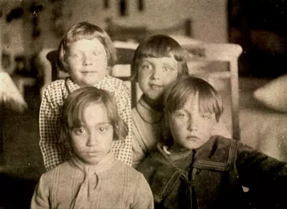 My uncle Aron's daughters: Rita in the lower row on the right and Lida in the upper row on the left, and their friends. They both perished in Mirgorod in 1941. This photo was taken in Leningrad in 1940.
