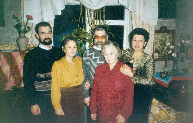 This is a photo of my family: my grandson Denis Razumovsky (first from left), my son Alexei Razumovsky (in the center), his wife Nina Razumovskaya (second from left), my daughter Olga Razumovskaya (first from right) and me, Rita Razumovskaya (second from right). It was taken a couple of years ago, in the early 2000s, in St. Petersburg, at our place. It was some holiday, I don't remember which one exactly.