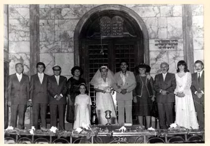 This photo was taken at the Neve Shalom Synagogue, at the “teva” in 1979. This was my daughter’s wedding ceremony. The people in the photo are from left to right: my father-in-law, Menahem Behar Bitek, my son Rober Schilton, I am standing beside my son (Sami Schilton) and my wife Suzi beside me; then the bride Rita Raiser (nee Schilton) and her husband Cako Rasier, beside him his aunt Dora Rasier and his father Rafael Rasier, then Dora Rasier’s daughter and her own husband Izak Rasier. I don’t remember who the little bridesmaid in front was.