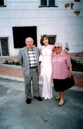 My son Mikhail took this photograph at the prom of his older daughter Tatiana. From left to right: my husband Aron Pizman, Tatiana Pizman and me. We were photographed in the school yard. This photo was taken in Mogilyov-Podolskiy in 2004.