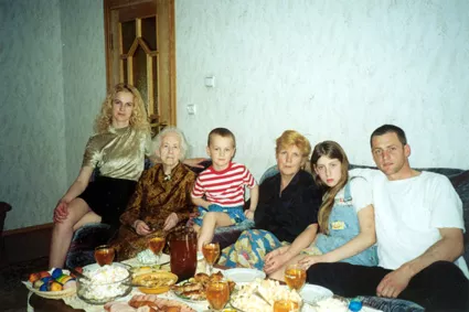 This is my family. From left to right - my granddaughter Diana, I, Riva Smerkoviciene, my grandson Karolis, my daughter-in-law Alina, her daughter Laura and Laura's husband Deinis. The picture was taken in my apartment in Kaunas in 2004 during Diana's visit from Germany, where she lives.