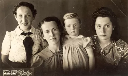 This picture was taken in Kaunas in 1945. I, Riva Smerkoviciene, and my daughter Lena are in the center. My friends, colleagues from the orphanage - Riva (to the left) and Taube (to the right). Riva died. Taube is living in Haifa. I can’t remember their last names.
