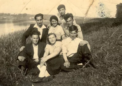 This picture was taken in 1934 during my exile in Shimkayche, where I was sent for underground Communist activity. I, Riva Smerkoviciene, am in the 1st row in the center wearing a white blouse, surrounded by my friends from the underground. Sitting to the right in a white shirt is Yakov Ratskevich. He was shot during one of the demonstrations. Masha Orlyanskaya is next to him. She was in occupation. She died in the 1980s. Itshak Smerkovicius is standing.