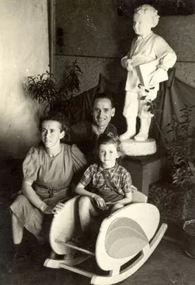 This is my daughter Lena and I, Riva Smerkoviciene, with my husband Gutman in the assembly hall of the Jewish kindergarten in Kaunas, where Lena used to go. The picture was taken against the background of a child statue of Lenin in 1947.