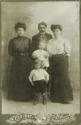 This is my mother's family from left to right standing: my grandmother Roche-Leya Meyertal, my grandfather Zalman Meyertal. I do not know the lady standing to the right from Grandfather. Mother's brother Hirsh is sitting on a high stool. The eldest child, Isaac, is standing in front of him. The picture was taken in Tartu in 1908.