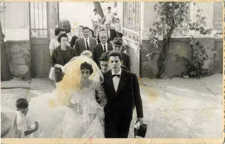 The people in the photograph: Luna Romano (Razon) - Menahem Razon. On the way to the synagogue.. I am waiting inside. Entering the synagogue in Edirne. Because my wife’s father passed away three months before the wedding, her older brother was bringing her to the synagogue.