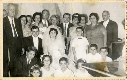 A photograph taken at home after the wedding. The whole extended family of Yasef Romano. My father is on the very left, and his brother on the right. You might know him. He is Izak Romano, the cheese-maker.