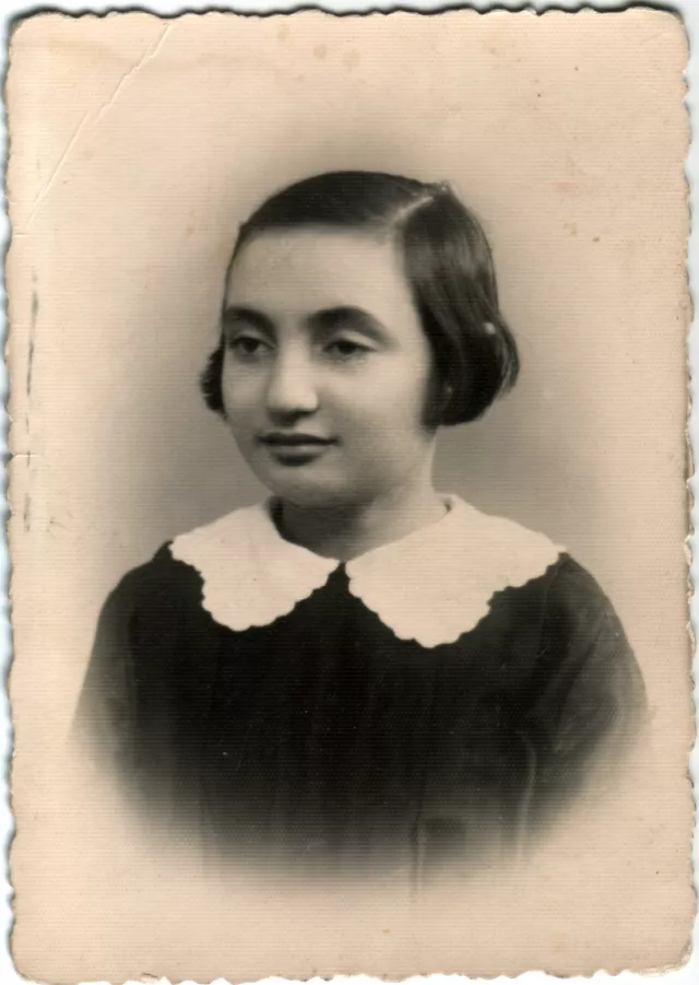This is me, Rosa Kaiserman, in the first grade in primary school, with a black uniform – it was made of some black satin, like a frock, which was buttoned at the back and had pockets and an embroidered collar.
