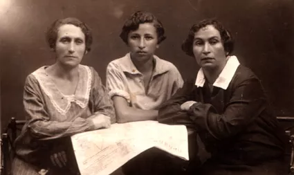 From left to right: my mother Rosa Levina, nee Shatovskaya, my older sister Nadezhda Levina and my mother's sister Evgenia Levina, my father’s younger brother David's wife. There is a 'Pravda' newspaper on the table. This photo was taken when my mother and Nadezhda were visiting Evgenia in Mariupol, where she lived with her family, in 1926.