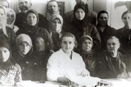 This photograph was taken in 1939 in a small out-of-the-way Latvian village. I have no information about who had taken it. On the photograph you can see my aunt Rosa surrounded by her patients.