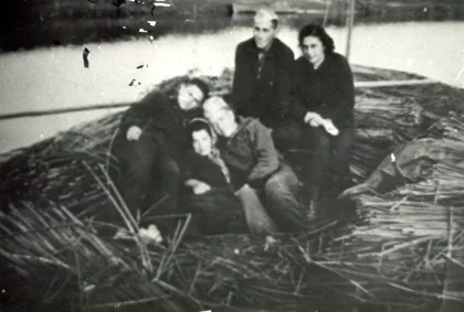 This is I sitting behind my friends. The picture was taken on the picnic out of town. My friend Birute is in the center. To the right from her is Bushtem (I do not remember his name) and to the left is Jakob Shaum. Max is sitting next to me. I do not remember his last name. Birute is currently living in Israel. Other guys perished during the war. The picture was made in Liepaja in 1939.