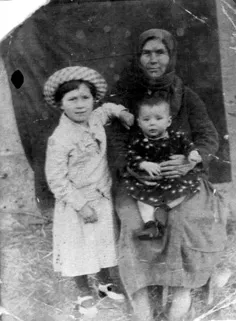 My grandmother Surah Abramson, my father's mother, and my sisters. Sonia, born in 1930, wearing a hat, is on the left. Tamara, born in 1934, is sitting on my grandmother's lap. My grandmother came on a visit from Mogilyov-Podolskiy.