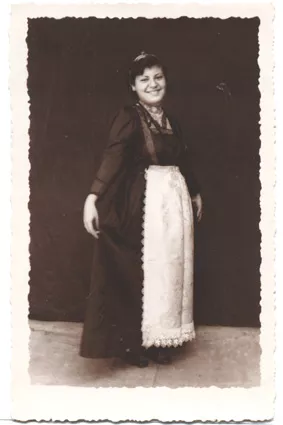 This photograph of me was taken in the mid-1930s. This is not my daily attire but on this day we had gone on an excursion to a village outside of Thessaloniki and a girl from the village offered her traditional costume for me to wear and be photographed wearing it. This specific costume is a traditional costume of the Greek Orthodox women of Northern Greece.