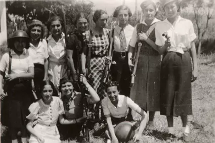 This photograph was taken in 1937. It is an excursion to the border of Greece with Bulgaria with friends and family. The soldiers who were doing their military service at the border lent us their guns and helmets for the photograph. I am in the middle of the bottom row.