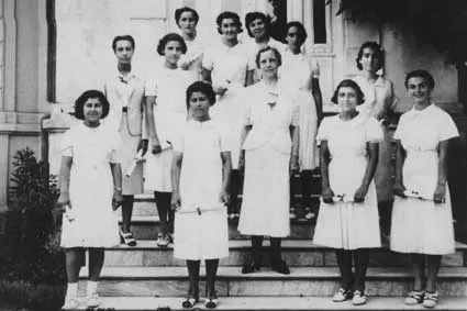 In the center of the photograph you can see the principle of the school, Mrs. Morley. the woman second from the left in the top row was my best friend Eugenia, who was Greek Orthodox. The fourth from the left in the top row is Rene Santiel, who married Mr. Molho, who owned one of the largest bookstores of Thessaloniki. The first woman from the left in the second row is Elli, another Greek Orthodox friend. IIn the bottom row are four students of who one is Albanian and two are Armenian.