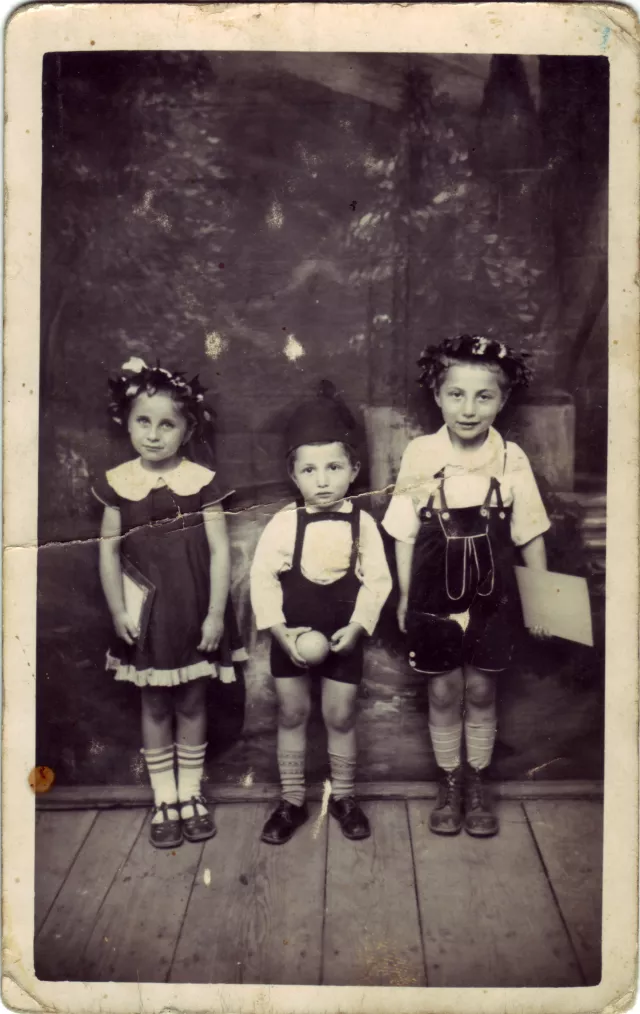The one to the left is my little sister Rozica Calmanovici and the others are my two little cousins, Iancu and Froim Mendelovici, sons of my mother’s sister, Branica. Froim is the one to the right. He and my sister had just finished first grade. They both got a flower coronet for their results. And they also got a book, see? Look at how proud she looks! This was a Bordeaux red dress with a white collar. She was so pretty. The boys used to wear striped velvet pants, as far as I remember. The back of the picture reads: “A souvenir from Calmanovici Rozica, Botosani, at the age of 6”.