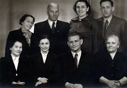 This my brother Rudolf's wedding in 1952 in Bratislava. In the bottom row, from right to left: our mother, my brother Rudolf, his wife and his wife's mother. Standing in the upper row, from the right to the left are my older brother Andrej, then I, Ruzena, standing beside me is uncle and then an aunt of my brother's wife.