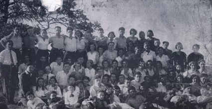 This is the meeting of the Jewish community in Zagare in 1930s. Here us the youth of the town. The third to the left in the bottom row is father's sister Liba Beitler, father's brouther Ruvim Beitler is the third in the top row. I do not remember the rest, though at that time I knew almost all of them. Most of those people had not survived the war.