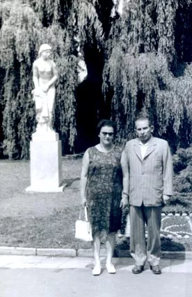 This photo was taken of my husband and I in 1976 in the Podebrady Spa. My husband went every year to the spa, because he had heart problems, and I always escorted him. There was a clock here, he stayed here, and across from it was this clock and the stature.